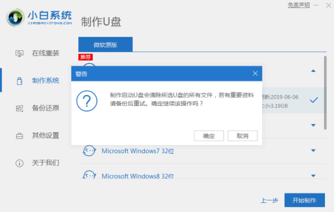 1、首先在網上下載好小白系統軟件,并將u盤插入電腦,點擊制作u盤,點擊開始制作。