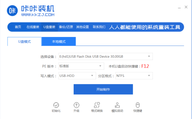 1、先下載咔咔裝機軟件,并將u盤插入電腦的USB插口處,關閉殺毒軟件,打開咔咔裝機,選擇“U盤重裝”進入。