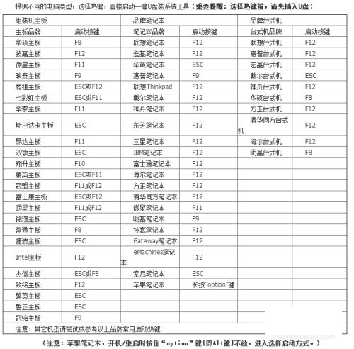 1、在電腦上插入制作好的啟動U盤,重啟電腦時不停按F12、F11、Esc或F7快捷鍵,下面是各種品牌主板、筆記本、臺式一體機的u啟動熱鍵一覽表,根據不同的電腦品牌,選擇對應的按鍵即可調出啟動菜單選擇界面: