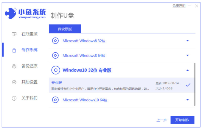 2、進入到小魚系統的制作系統軟件界面,選擇制作U盤選項,點擊開始制作,系統此時會自動給出適合安裝的版本。