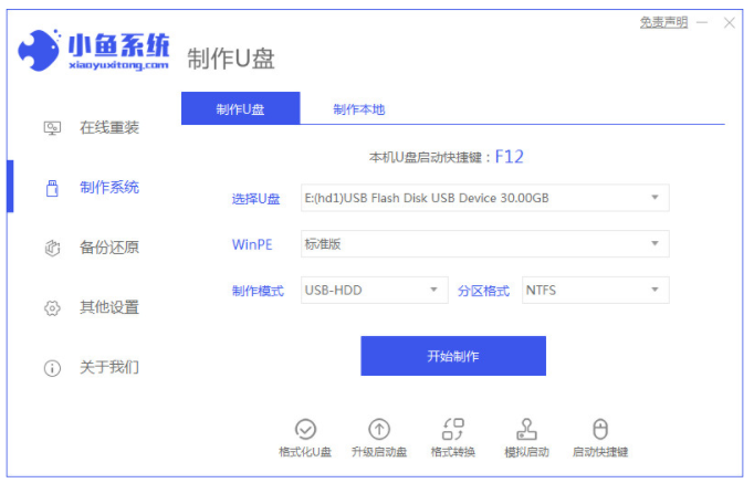 1、打開小魚重裝系統軟件,選擇制作U盤開始制作;