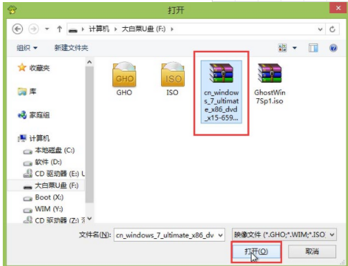 5、找到我們事先放置在U盤中的win7系統或者win10系統文件。選中后點擊“打開”進入下一步。
