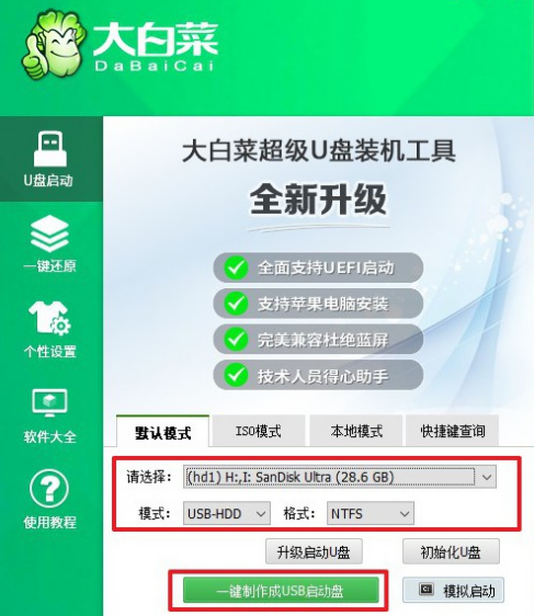 之后,打開大白菜制作工具,默認設置,點擊一鍵制作,耐性等待即可。