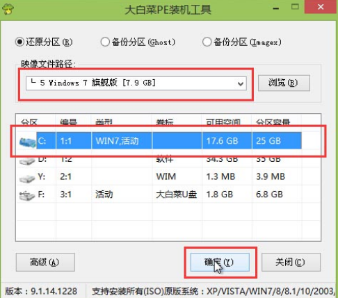 6、在映像文件路徑中,我們可以選擇需要安裝的系統類型,選擇完成后選中C盤,然后點擊“確定”。