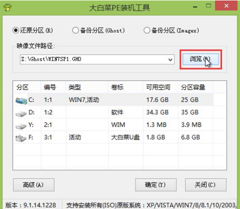 4、然后會進入大白菜PE桌面并彈出PE裝機窗口,這個時候我們點擊“瀏覽”選擇我們需要安裝的系統。