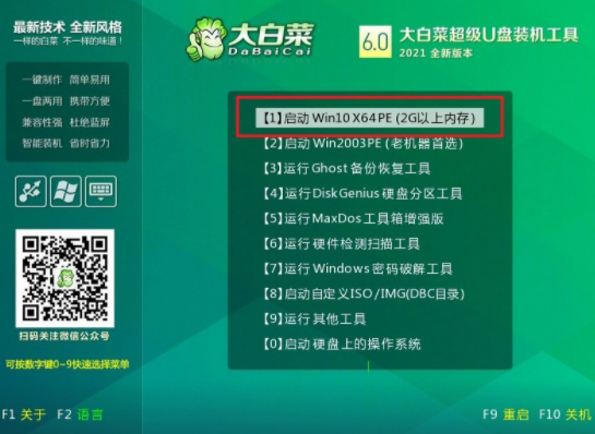 如圖所示,選擇【1】Win10X64PE(2G以上內存),回車進入大白菜PE桌面。