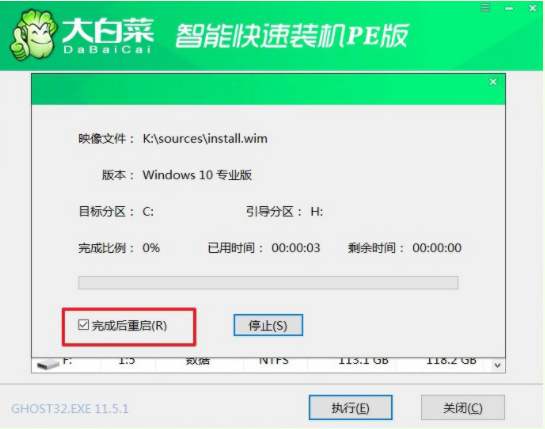 大白菜重裝系統的過程中,會多次啟動,第一次重啟時,拔出u盤后,無需操作。