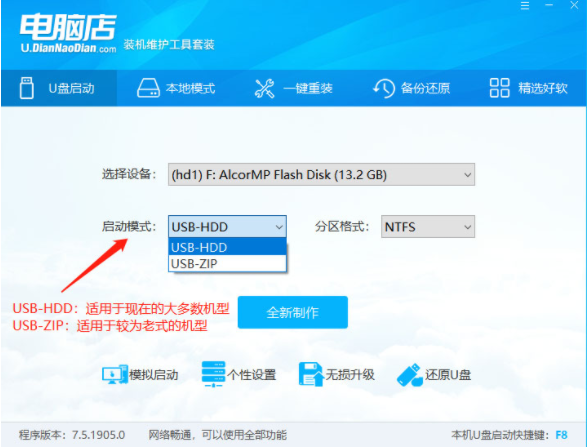 2、選擇“u盤啟動”,點擊需要制作啟動的設備,在模式選項中選擇“USB-HDD”,格式選擇“NTFS”。