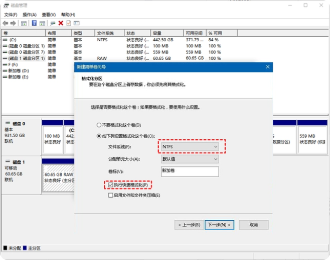 3、選擇正確的文件系統,分配單元大小選擇“默認”。然后按“確定”按鈕等待格式化完成即可。