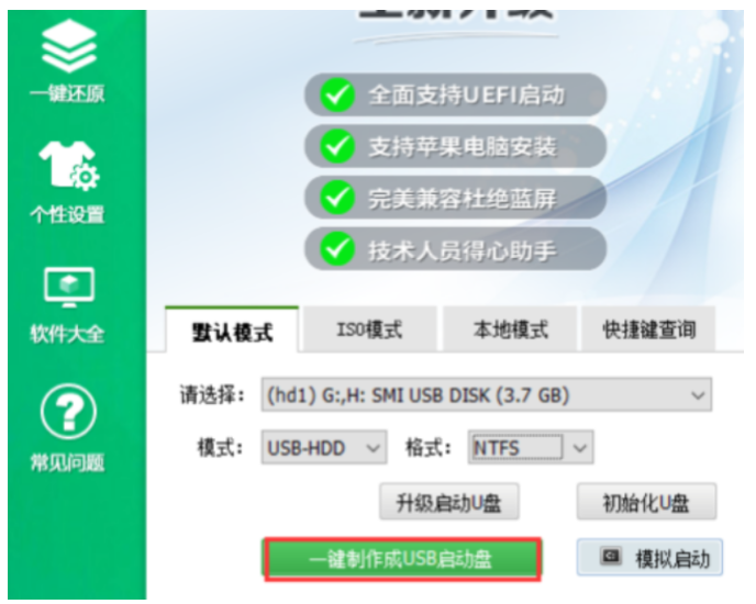 3.點擊USB-HDD,選擇NTFS,然后勾選一鍵制作USB啟動盤。