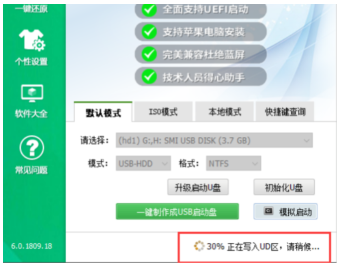 1.首先點擊打開超級U盤機工具,勾選主頁界面上的“U盤啟動”模塊,鼠標點擊【默認模式】。