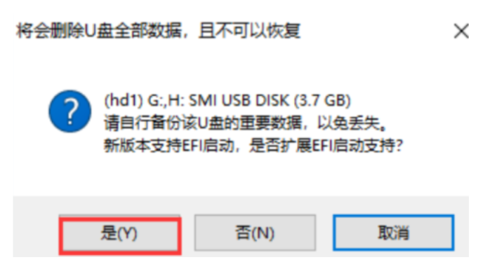 4.點擊一鍵制作,【U盤數據刪除且不可恢復】的窗口的界面,選擇【是】即可。