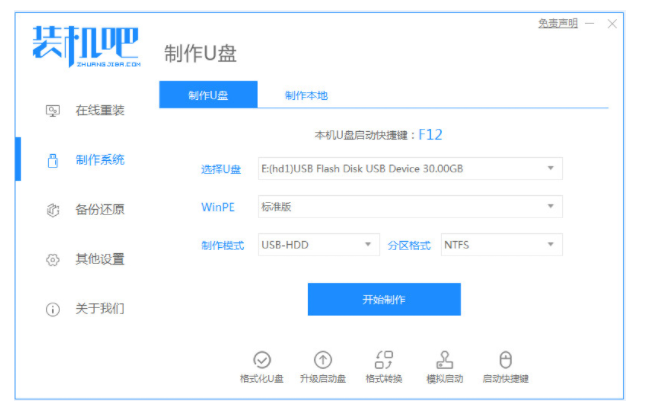 1、下載并運行裝機吧軟件,插入U盤,打開軟件,選擇制作系統。