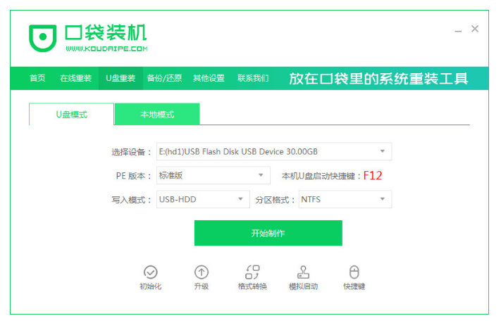 1、下載口袋裝機工具軟件,插入U盤,點擊U盤重裝系統。