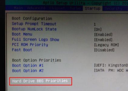 5、如果是如下界面,按→方向鍵切換到Boot或Startup,選擇Hard Drive BBS Priorities,回車;