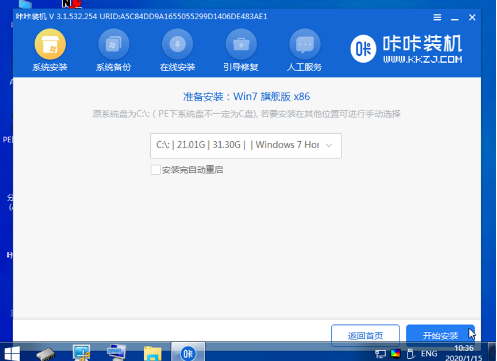 5、在pe系統桌面,打開咔咔裝機工具,然后選擇需要安裝的win7系統點擊安裝。