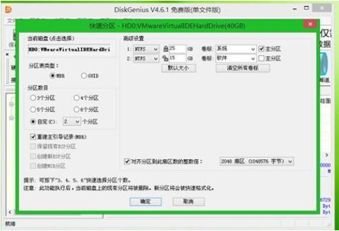 5、設置分區數目和分區的大小,一般C盤建議35G以上,如果是固態硬盤,勾選“對齊分區”即可4k對齊,點擊確定,執行硬盤分區過程。