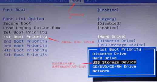 2、通過bios快捷鍵進入boot頁面,設置u盤為第一啟動,然后重啟。