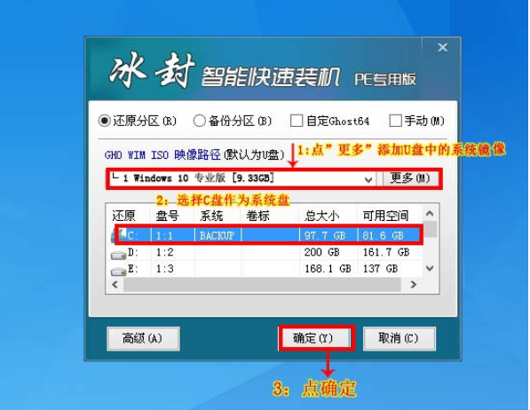 6、進入pe后會自啟u冰封pe裝機工具,點擊"更多"將保存在u盤的系統鏡像添加進來,接著選擇c盤作系統盤存放鏡像,點擊“確定”即可。