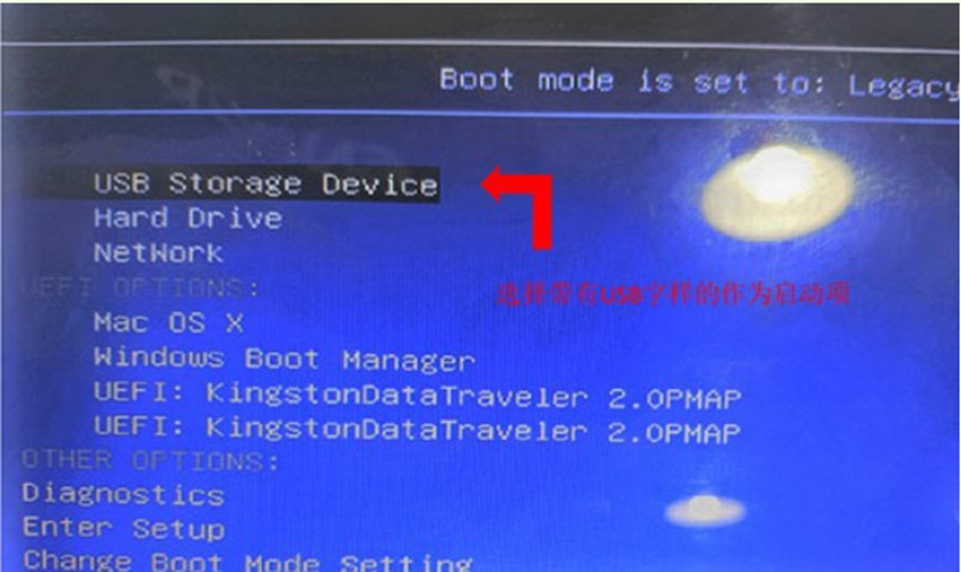 8、開機后按熱鍵進入bois,選擇USB選項,回車。