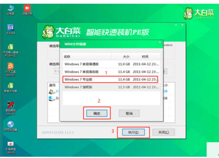 5、選擇之前準備在U盤里面的ISO鏡像安裝。參考下圖:選擇“Windows 7 SP1 64位專業版。點擊“確定”,再點擊“執行”后會彈出大白菜一鍵還原的窗口。