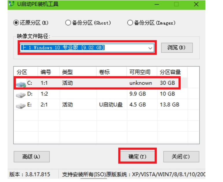 2、接著在工具中找到win10pe系統iso鏡像文件,在分區列表中選擇C盤作為系統盤,點擊“確定”。