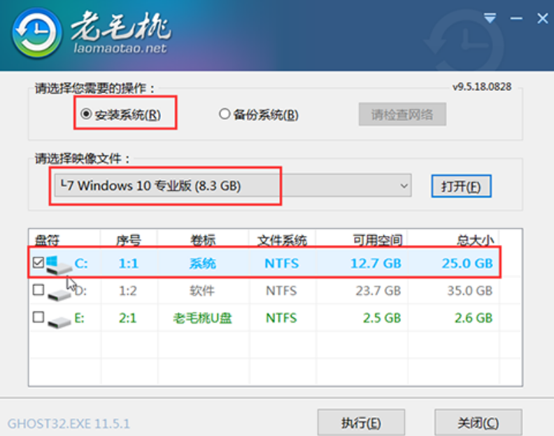 打開老毛桃一鍵裝機軟件,選擇系統鏡像安裝到系統盤c盤,點擊執行。