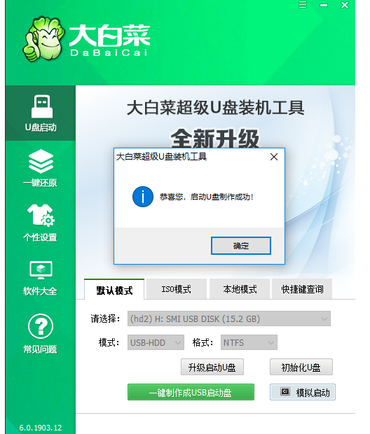 1、大白菜u盤裝系統如何操作呢?下載安裝好大白菜u盤啟動盤制作工具,并進行解壓安裝的操作,插入U盤到電腦上,打開安裝好的大白菜U盤啟動盤制作工具,如果沒有特殊的要求的話,則可以使用默認的模式與格式,點擊“一鍵制作成U盤啟動盤”按鈕。