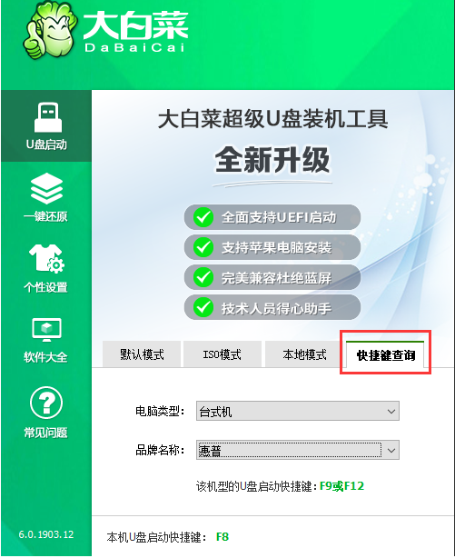 1、接著將需要進行重裝系統的電腦重啟或者開機,開機的同時一直按U盤啟動快捷鍵,U盤啟動快捷鍵即可用大白菜工具的“快捷鍵查詢”功能進行查詢。