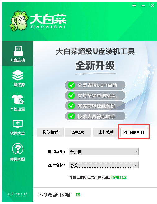 1、首先將需要重裝系統的電腦重啟或開機,開機的時候同時一直按U盤啟動快捷鍵,大白菜工具的U盤啟動快捷鍵“快捷鍵查詢”功能進行查詢注明:若該機型無法使用快捷鍵,接著即可設置BIOS/UEFI啟動順序進入PE。