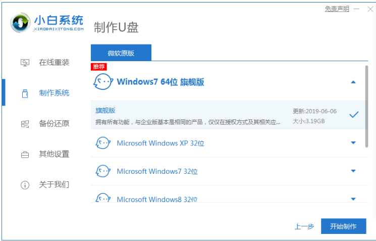 1、插入U盤到電腦接口上,打開小白一鍵重裝系統軟件,退出殺毒軟件,選擇制作系統中的U盤選項,選擇U盤,點擊開始制作。