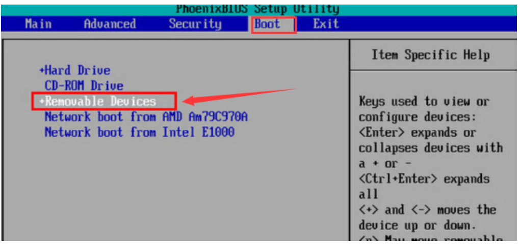 2.把光標移動到“boot”,找到u盤的選項,這里是“removeble device”。