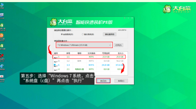 5、選擇“Windows 7 系統,點擊“系統盤(c盤)”再點擊“執行”