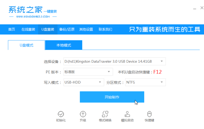 1、下載安裝系統之家一鍵重裝系統工具,關閉電腦的殺毒軟件,插入一個8g以上的空白u盤,選擇u盤模式開始制作。