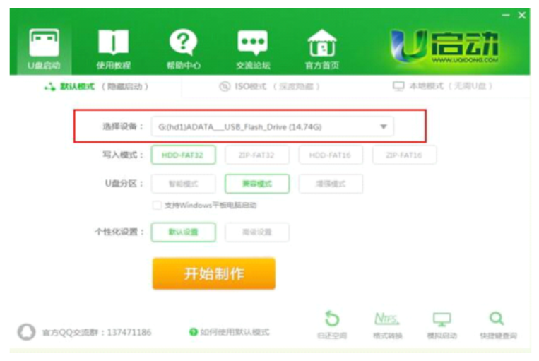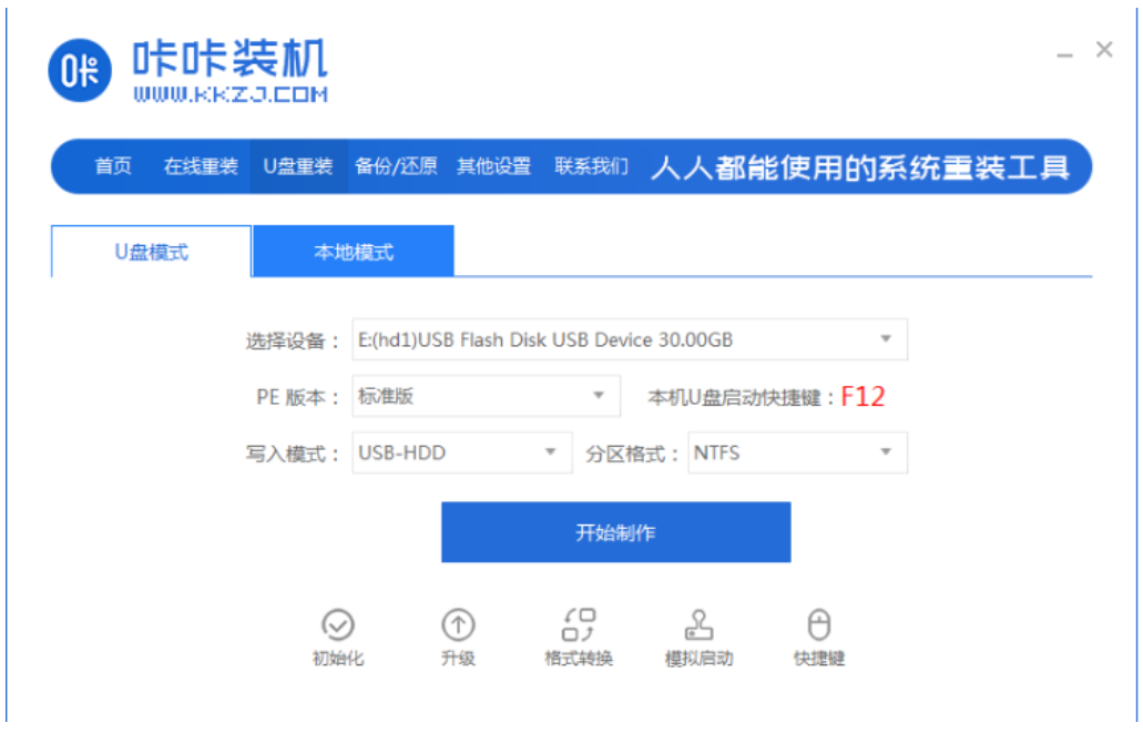 2、將U盤插入電腦上,選擇U盤設備,點擊開始制作。