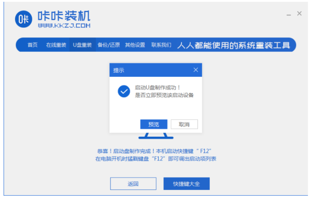 6、然后U盤啟動盤制作成功,點擊預覽,記住自己電腦的啟動快捷鍵即可。