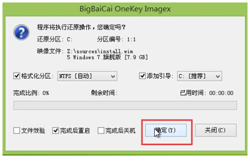 7.在彈出的窗口界面中選擇【確定】,進入還原的操作中,最后大白菜軟件自動開始重裝。
