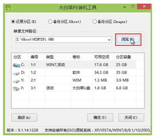 4.進入pe界面之后,點擊打開大白菜裝機工具,點擊【瀏覽】,選擇所需的系統。