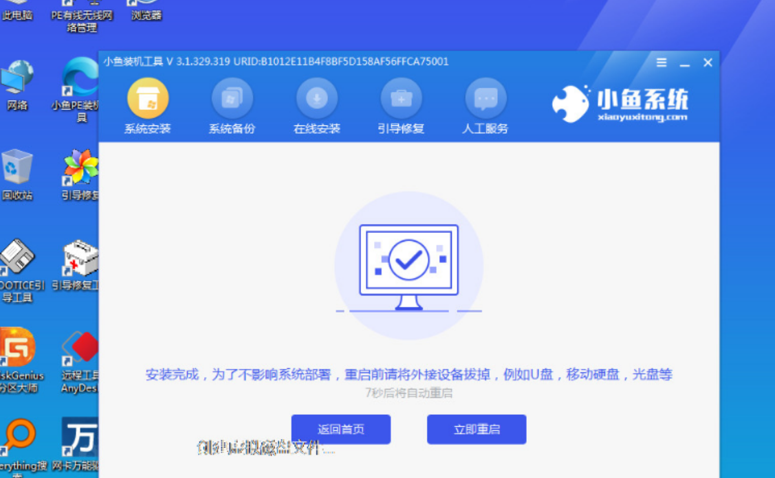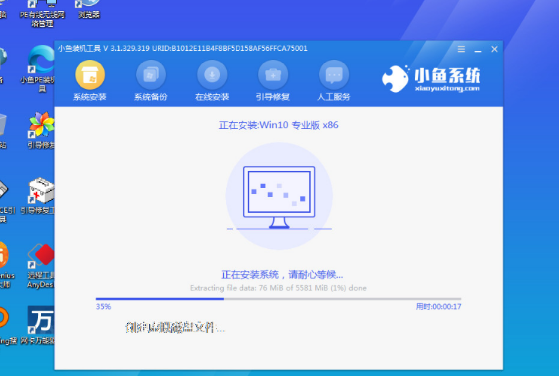 4、插入啟動盤進電腦中,開機按啟動熱鍵進啟動界面,選擇u盤啟動項回車確定進入到小魚pe系統,在pe系統桌面上打開小魚裝機工具,選擇系統點擊安裝。