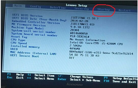 2、小編以聯想的筆記本為例,(方法都是大同小異),點擊Startup選項卡。