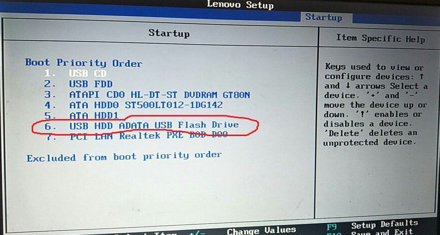 4、通過下鍵將光標移動至"USB HDD"開頭的那個項目名稱上(有的BIOS也叫removeble device),小編這里是以聯想BIOS為例,其他品牌也都差不多。
