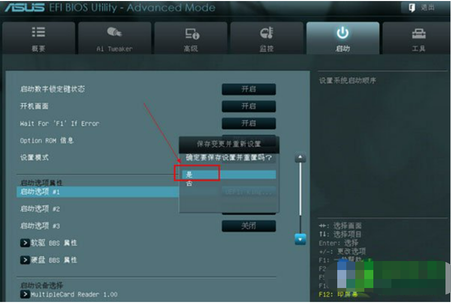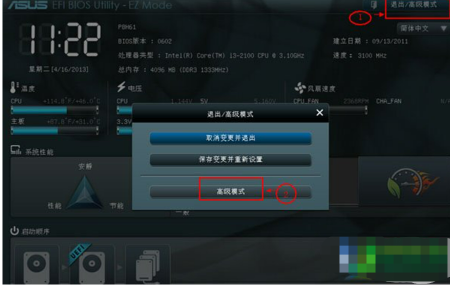 1、方法一同樣的方法進入到華碩主板uefi bios界面,點擊右上角“退出/高級模式”,在彈出的窗口中使用上下方向鍵選擇“高級模式”項,按回車鍵執行。