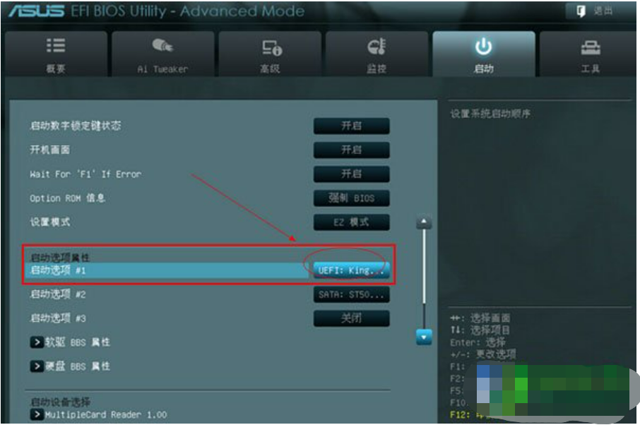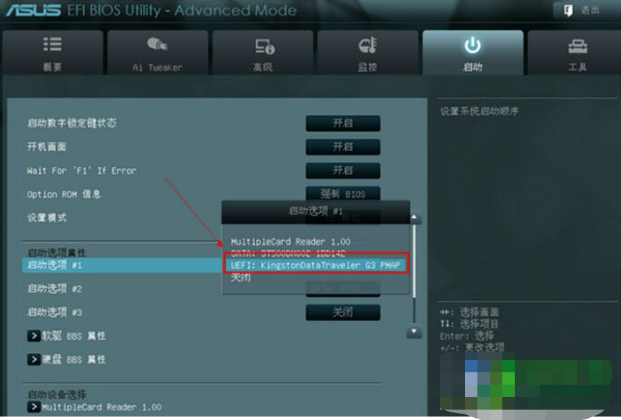 5、切換完成后,啟動選項#1會顯示成當前插入電腦的啟動u盤。