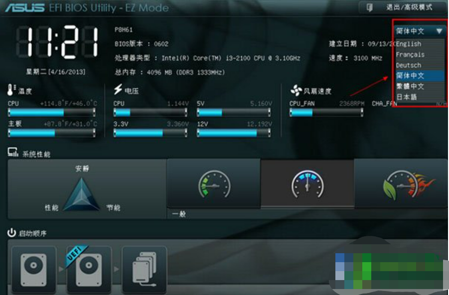 2、這時候就可以進入到華碩主板uefi bios界面,再點擊右上角將文字顯示類型設置為“簡體中文”模式。
