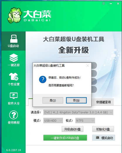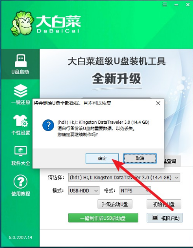 方法一:下載“大白菜U盤啟動盤制作工具”插入U盤,選擇默認制作成U盤啟動器。