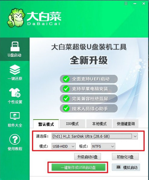 2、 接著,設置模式和格式,一般默認選擇USB—HDD以及NTFS,點擊一鍵制作成u盤啟動盤。