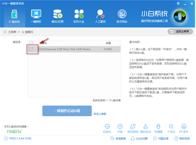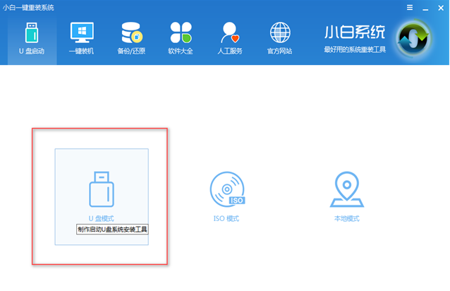 1.打開小白一鍵重裝軟件,選擇u盤模式。