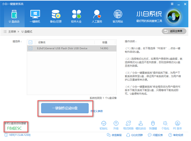 方法二:下載打開“小白一鍵重裝系統”點擊一鍵制作啟動U盤,選擇要安裝的系統下載,耐心等待即可。