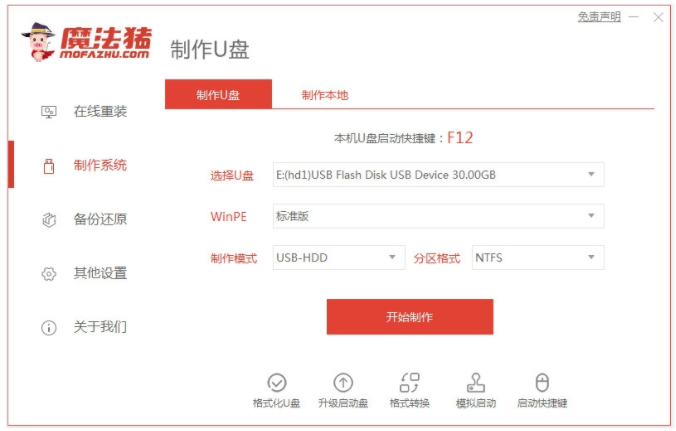 1、在可用的電腦上下載安裝魔法豬裝機大師工具,插入空白u盤,打開軟件后選擇制作系統點擊開始制作。