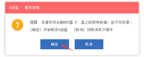 2、在彈出的信息提示窗口中,點擊"確定"進入下一步操作。注意:U盤里如果有重要文件請保存到其它地方,如下圖所示
